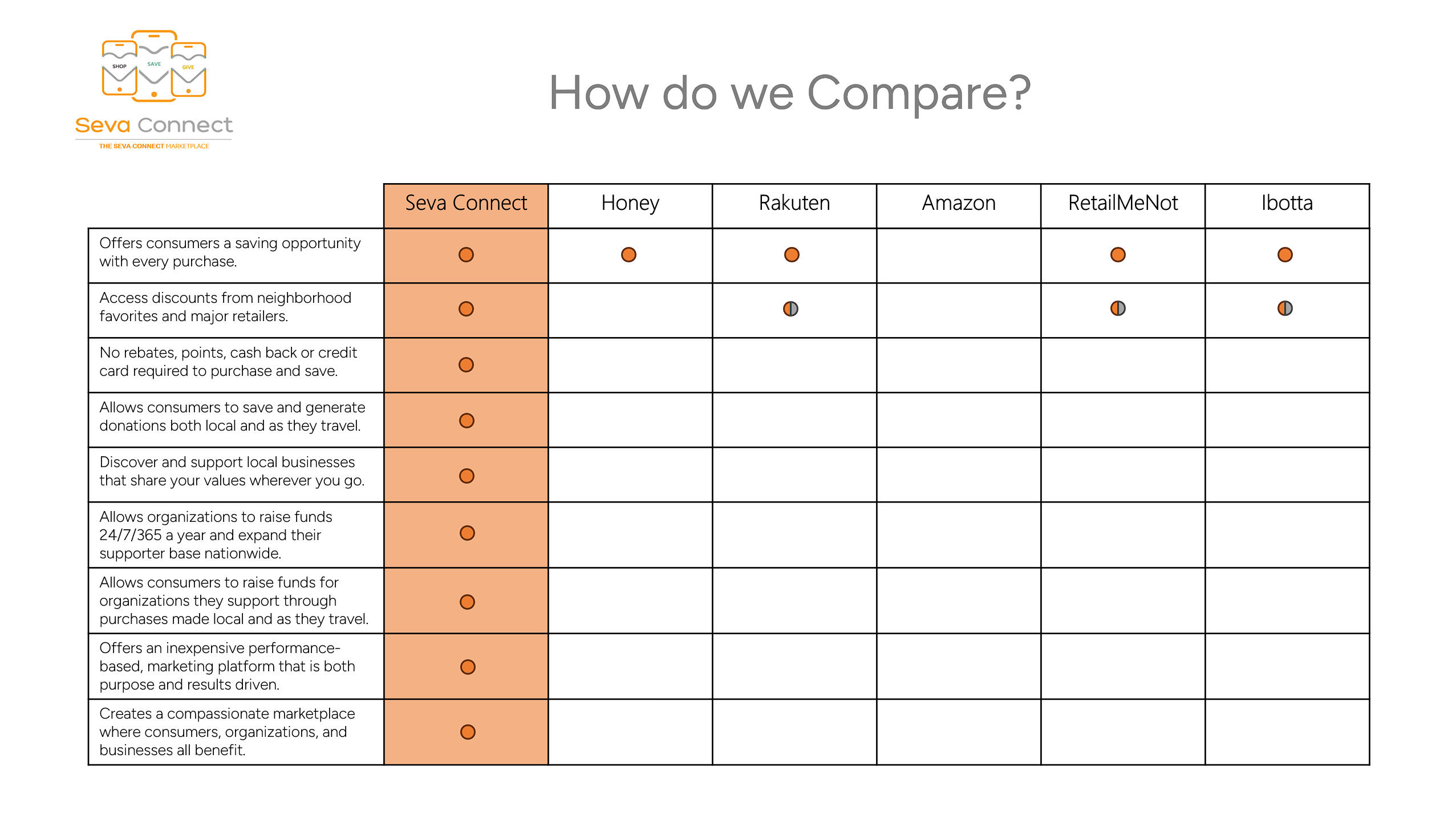 The Seva Connect marketplace supercharges consumers daily purchases, providing those who may not have the extra money to donate with a simple way to generate donations through their daily spending.Our marketplace also provides organizations with an innovative way to raise funds 24 hours a day 365 days a year, from anywhere in the nation. It creates an automated revenue stream that organizations can place on autopilot. Allowing organizations to expand their supporter reach and grow their supporter based nationwide.The Seva Connect marketplace, offers, small businesses an inexpensive, performance-based, marketing platform, that is both purpose and results driven. Allowing small businesses to create loyal consumer connections, and grow their customer base, increasing their social presents and engagement. It’s like hiring a digital marketing team without the cost, time or technical learning curve.